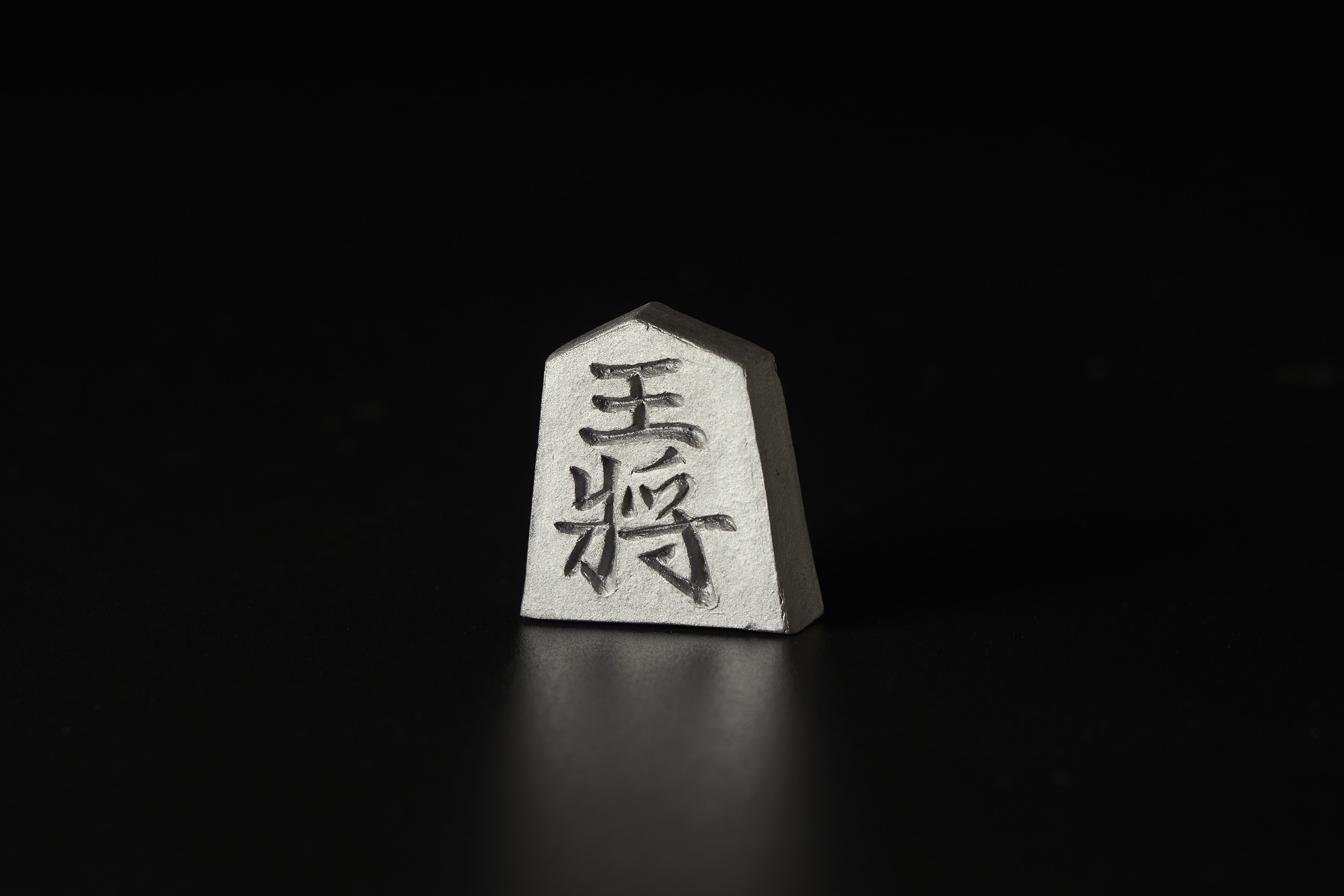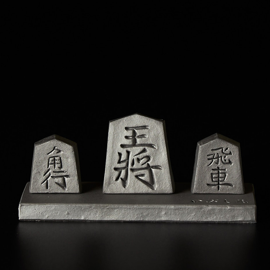 There are three different types of oxidised silver Shogi (Japanese chess) pieces made with traditional Awaji Island techniques, and the base for the display is also made of Awaji tiles.